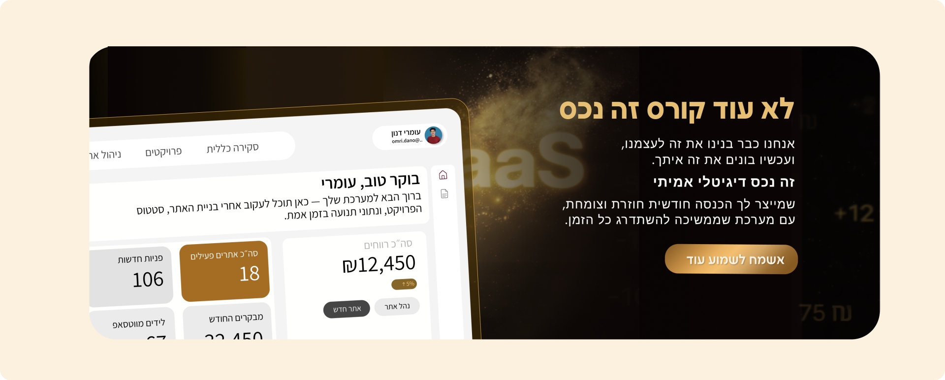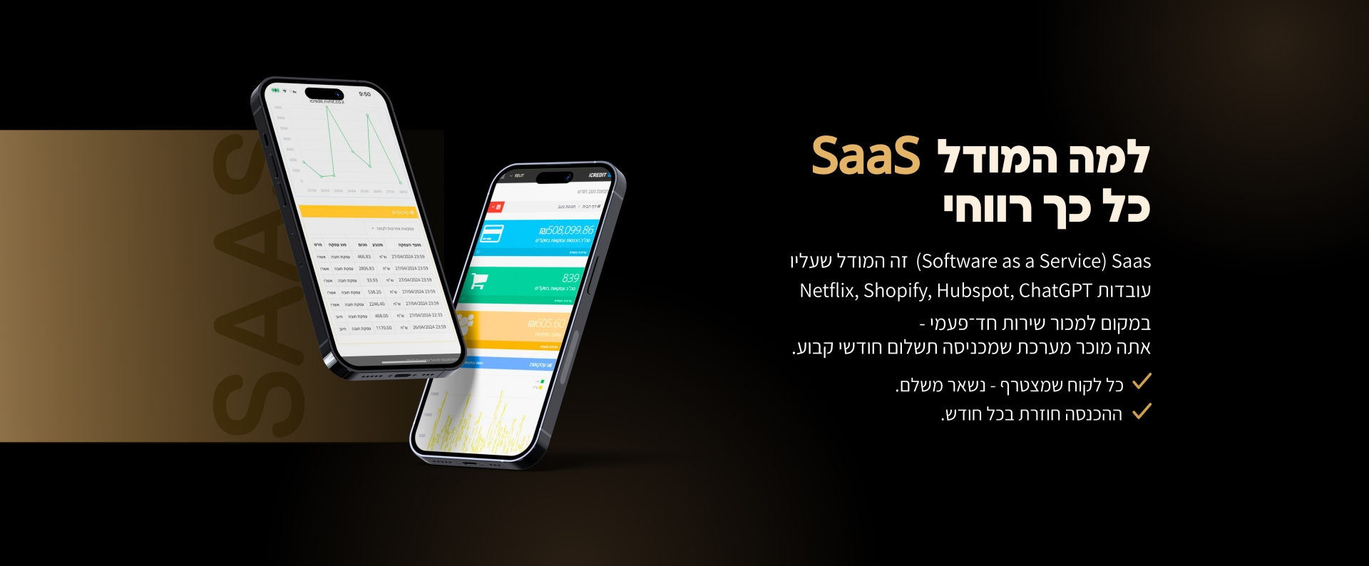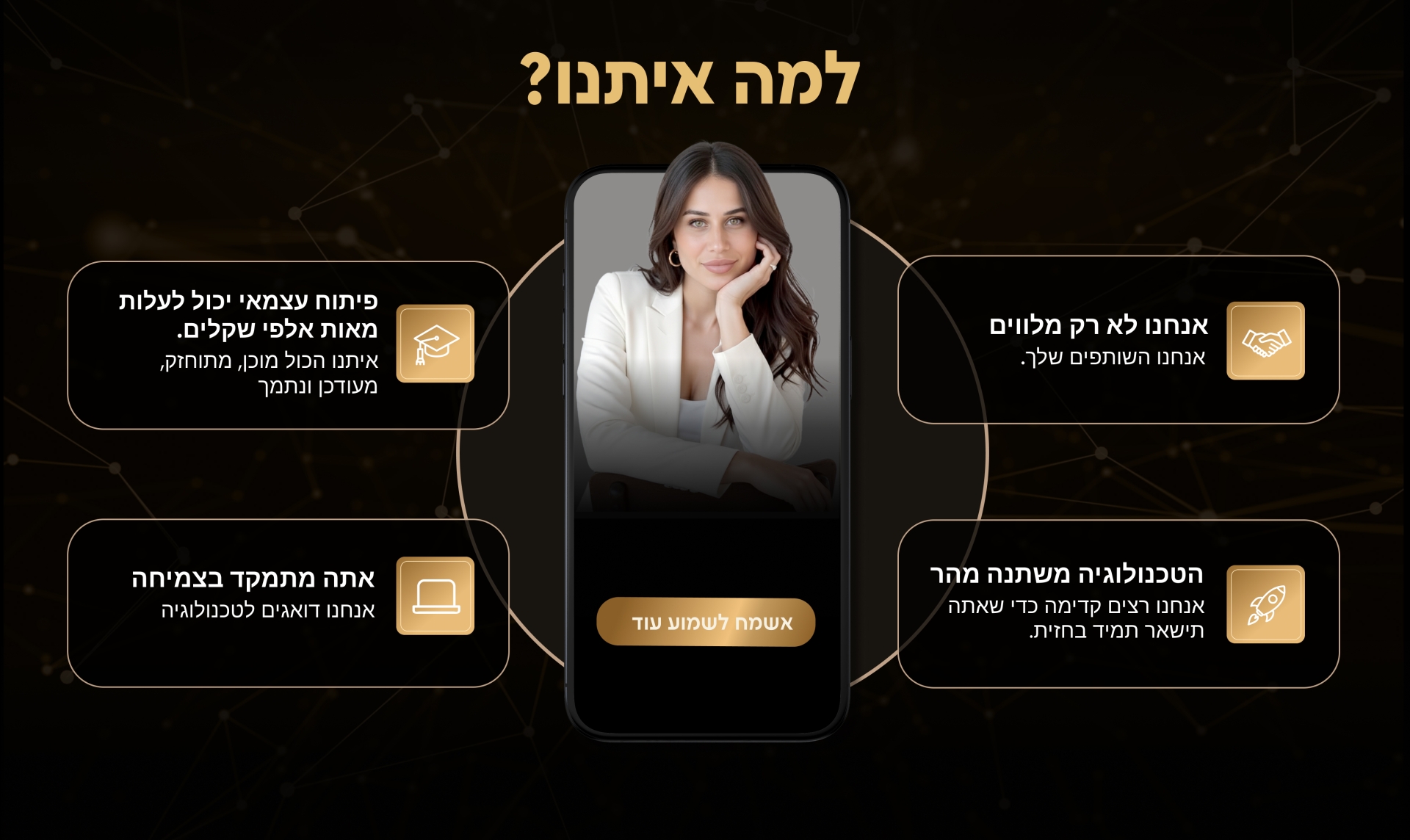 אנחנו לא מוכרים קורס – אלא נותנים לך עסק SaaS אמיתי ומוכן. במקום רק תיאוריה, יש לך מערכת שעובדת, וכך אתה מתחיל להרוויח מלקוחות שמשלמים כל חודש על השירות. אנחנו גם שותפים טכנולוגיים: הצלחה שלך היא הצלחה שלנו.