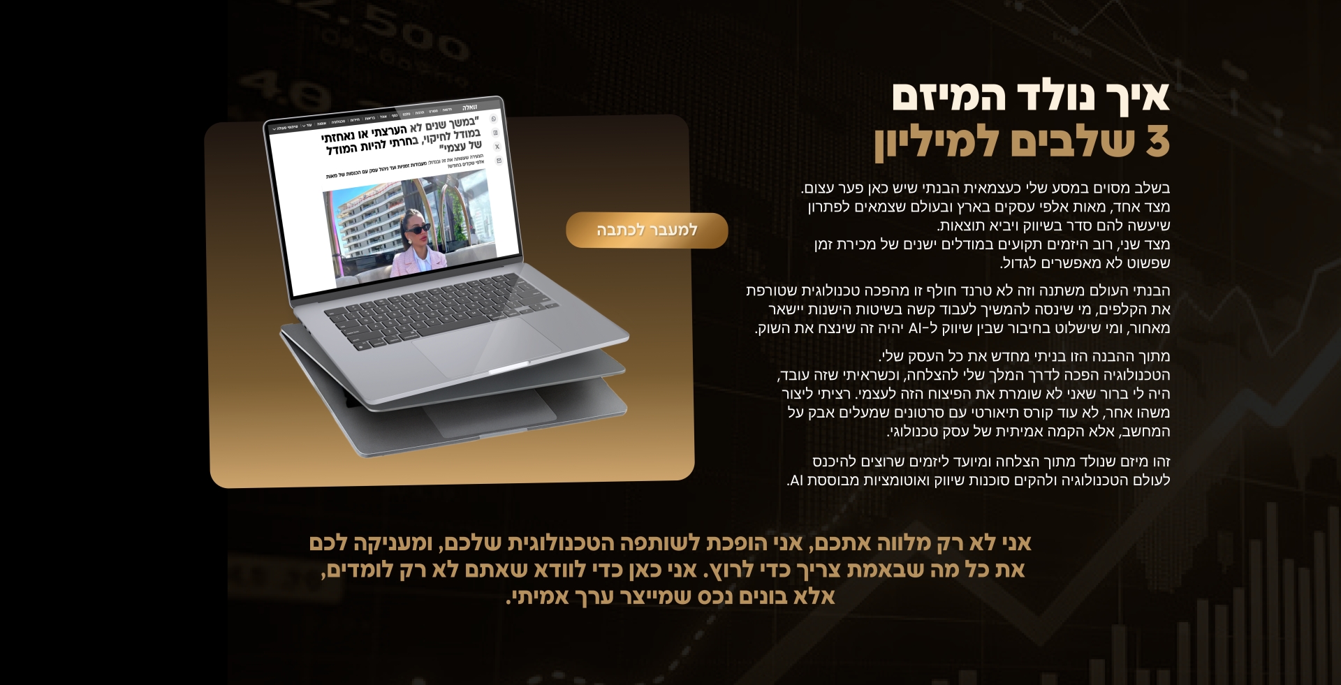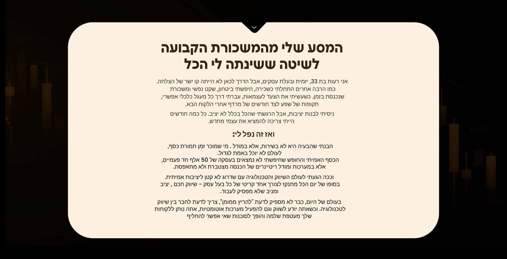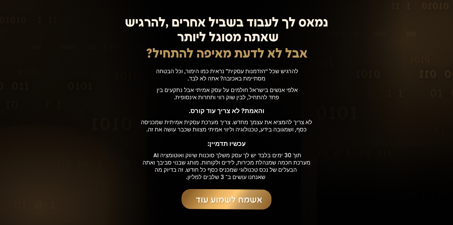 אנחנו לא מוכרים קורס – אלא נותנים לך עסק SaaS אמיתי ומוכן. במקום רק תיאוריה, יש לך מערכת שעובדת, וכך אתה מתחיל להרוויח מלקוחות שמשלמים כל חודש על השירות. אנחנו גם שותפים טכנולוגיים: הצלחה שלך היא הצלחה שלנו.