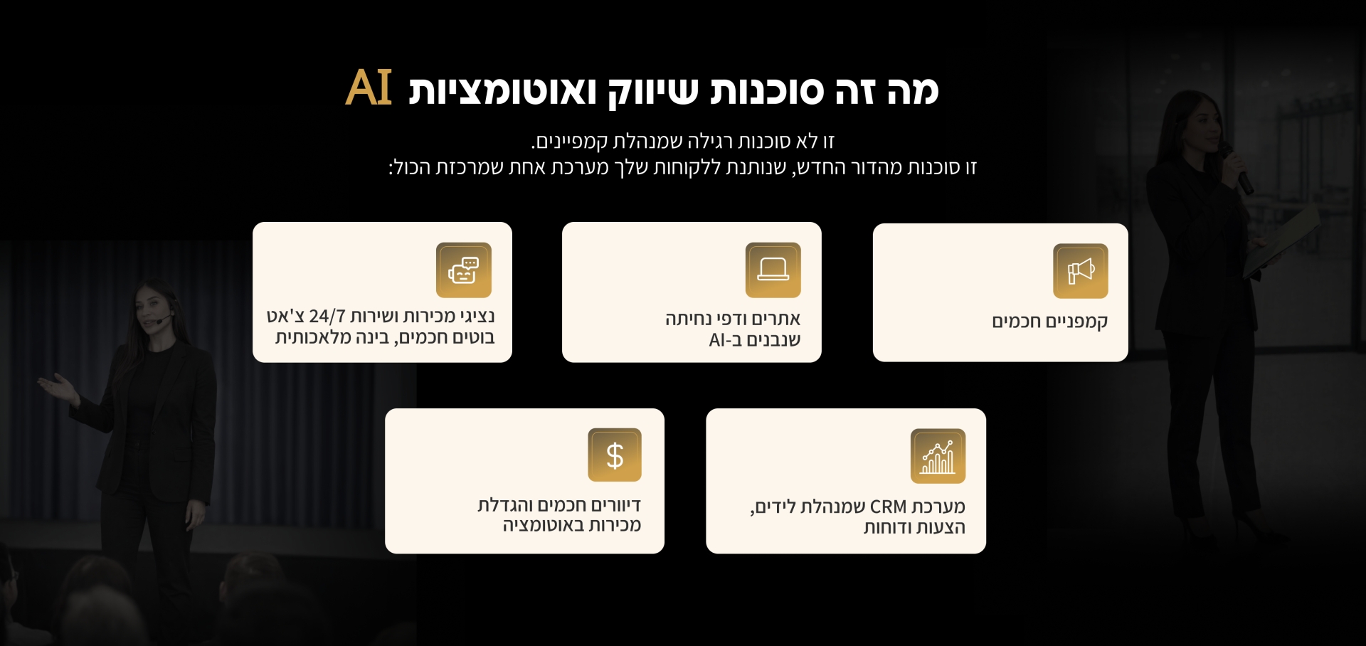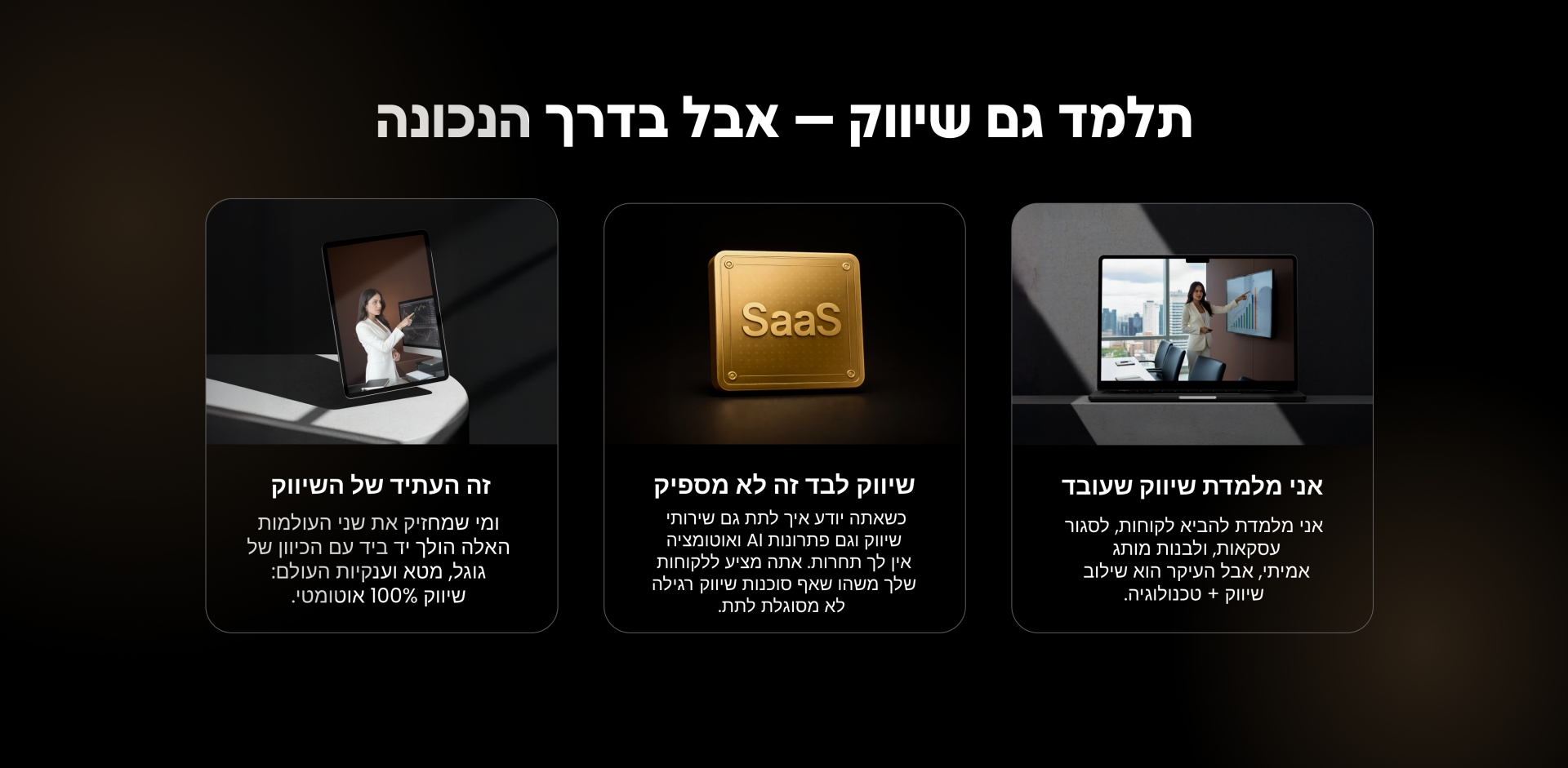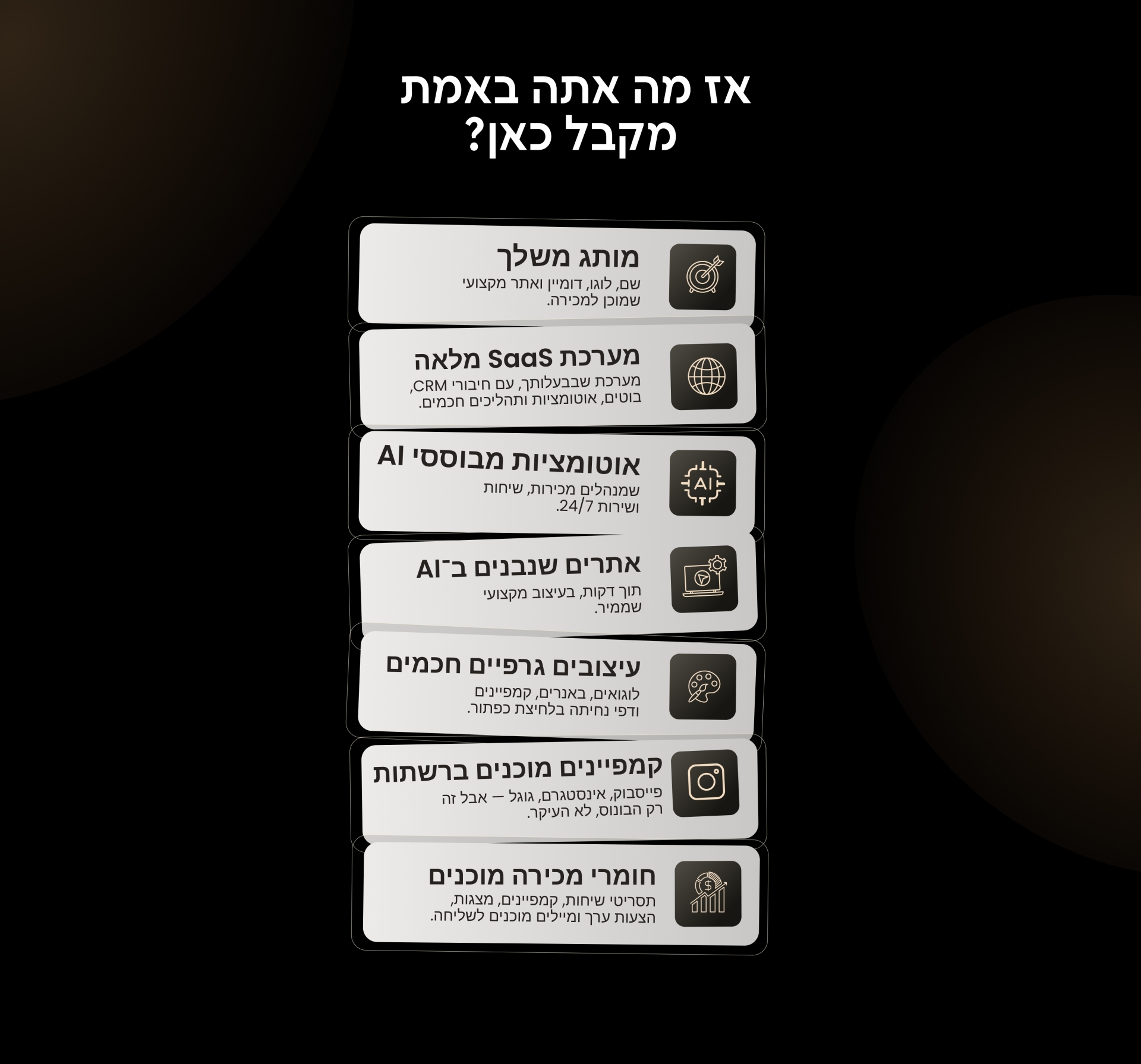 כן. אנחנו מלווים אותך צעד־אחר־צעד, מלמדים איך להביא לקוחות ולהסביר את הערך של שירותי SaaS. לא צריך להיות "גורו שיווק" – אלא להשתמש בכלים ובהדרכה שלנו כדי להגיע לקהל היעד הנכון.